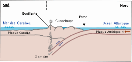 La Guadeloupe ne dispose pas de ressources d'énergies fossiles. Mais la géothermie est un atout énergétique majeur. Ainsi, une centrale géothermique a pu être installée sur le site de Bouillante. A l'aplomb de ce site, se situe une zone de fracturation de la roche à environ 500 mètres de profondeur ; dans cette zone de fracturation, les eaux infiltrées (eau de pluie et eau de mer) se réchauffent. Document ci-dessous - Contexte géologique de l'île de la Guadeloupe. À partir des connaissances, répondre au QCM en cochant la bonne réponse.