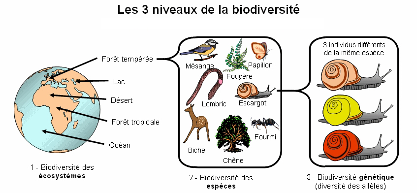 La biodiversité désigne toutes les variations du monde vivant. Cette diversité biologique est évidente lorsqu’on imagine la quantité fantastique d’espèces différentes (découvertes ou encore inconnues) qui vivent ou ont vécu sur Terre. C’est la biodiversité spécifique. Au sein de chaque espèce, on constate un autre niveau de biodiversité : la biodiversité génétique, c’est à dire la diversité des allèles d’un individu à l’autre. Ainsi, différents humains possèderont les mêmes gènes, mais pas les mêmes allèles de ces gènes. Le troisième niveau est la biodiversité des écosystèmes. Il correspond à la diversité des milieux de vie, incluant les espèces qui les habitent et toutes les relations qu’elles ont entre elles (qui mange qui, qui parasite qui, etc…).