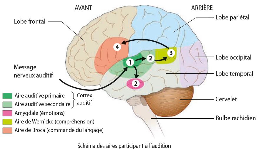 La structure de l’aire auditive est semblable chez les humains. Le cortex auditif primaire reçoit les informations en provenance de la cochlée. Il existe une régionalisation de l’aire auditive primaire : les sons graves sont perçus dans les zones à l’avant et les aigus vers l’arrière. Ensuite, l’aire auditive primaire envoie des informations vers l’aire auditive secondaire. L’aire secondaire permet de réaliser des associations avec d’autres aires, notamment l’aire de Wernicke (compréhension du langage) et également l’aire de Broca (commande du langage).