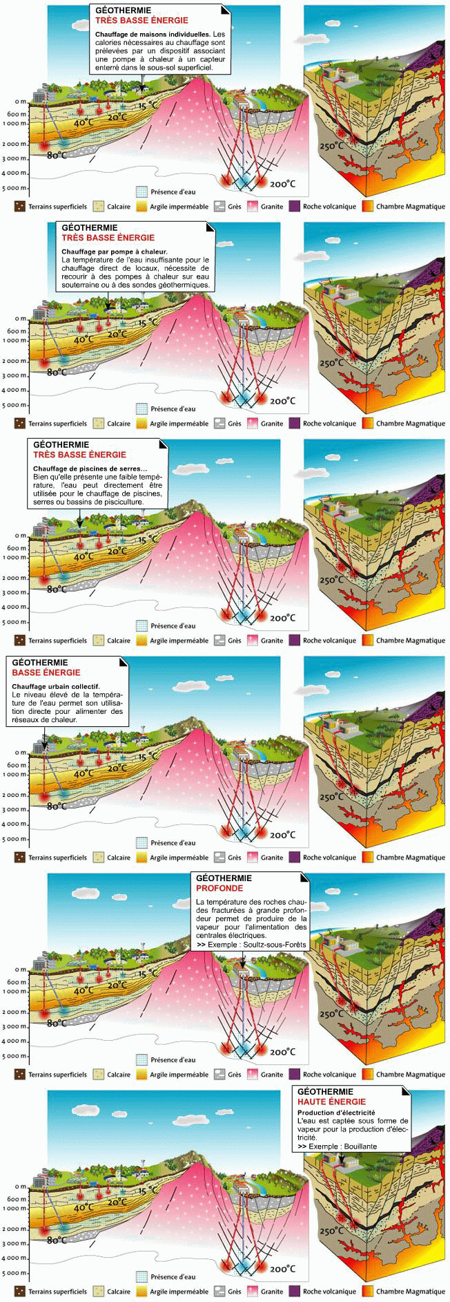 Il existe deux modes d’exploitation de la chaleur du sous-sol : la production de chaleur et la production d’électricité. Avec la géothermie à très basse (température inférieure à 30° C) et basse énergie (température entre 30 et 90° C), on récupère la chaleur du sous-sol pour l’exploiter directement ou grâce à des pompes à chaleur. Elle servira à chauffer des maisons, des immeubles, des piscines…
