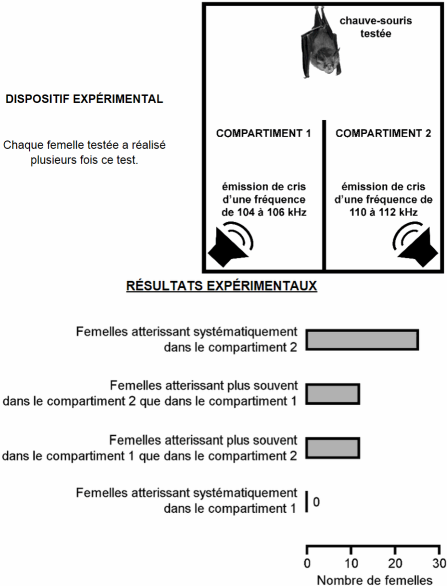 Les femelles utilisées sont placées tour à tour face à deux compartiments contenant chacun une enceinte qui diffuse des cris de rhinolophes de Mehely mâles. On note vers quel compartiment la femelle testée se dirige lorsqu’elle entend les cris.