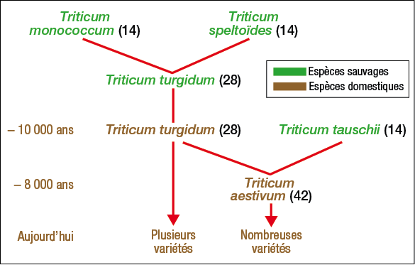Il existe également des espèces sauvages de blé : T. monococcum, T. speltoïdes et T. tauschi (T. = abréviation de Triticum). Les études cytologiques de toutes ces espèces ont permis d'établir l'origine des espèces de blé cultivées.