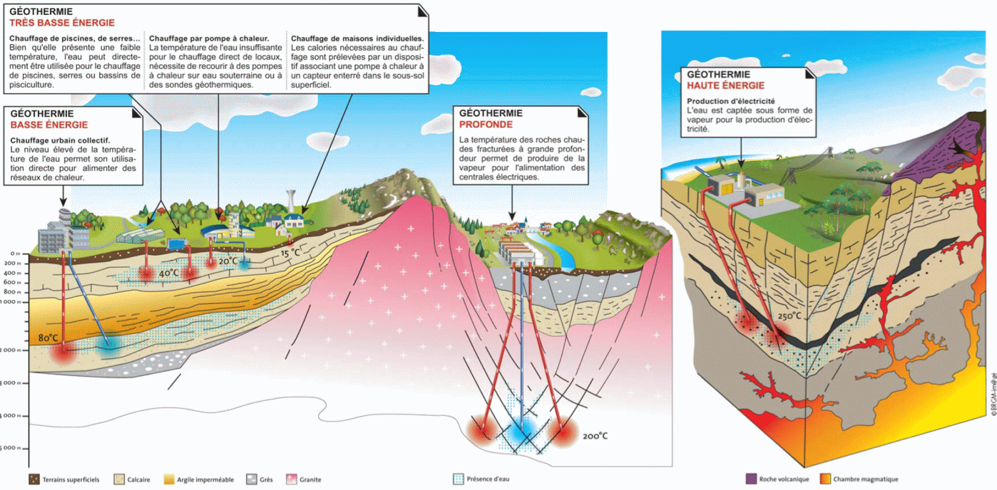 Contrairement à la géothermie classique, peu profonde, la géothermie à haute température est une technique de production d’électricité qui récupère la chaleur fossile dans les grandes profondeurs du sous sol : entre 2000 m et 5000 m !