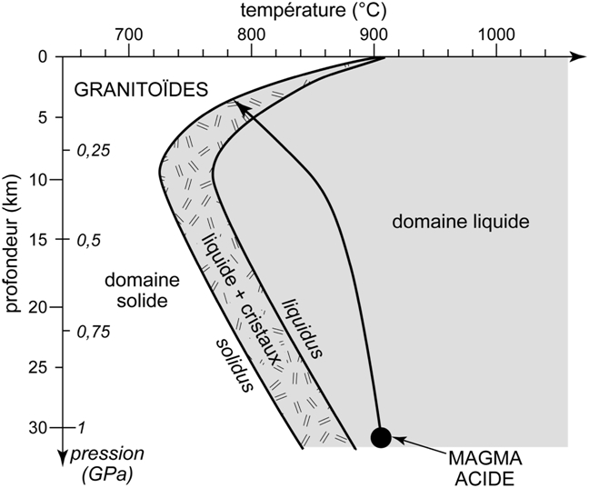 DOCUMENT : Trajectoire d’un magma acide dans un champ de pression-température lors de son ascension vers la surface. On rappelle que :