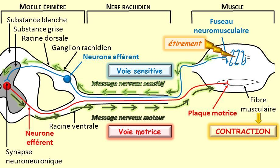 Le réflexe myotatique suit les mêmes voies que n’importe quel réflexe (réflexe nociceptif par exemple). Un message nerveux sensoriel, provenant de récepteur sensoriel, le fuseau neuromusculaire, se dirige vers la moelle épinière par la voie nerveuse sensorielle ou afférente. La moelle épinière joue le rôle de centre nerveux, intégrant le message sensoriel générant ou non une réponse motrice. La réponse motrice a pour origine un motoneurone qui émet un signal moteur par la voie nerveuse motrice ou efférente. Enfin le message nerveux moteur arrive au niveau des effecteurs moteurs, les cellules musculaires. L’intérêt de tester le réflexe devient maintenant évident, il permet au médecin d’avoir un indice sur l’état de la moelle épinière.