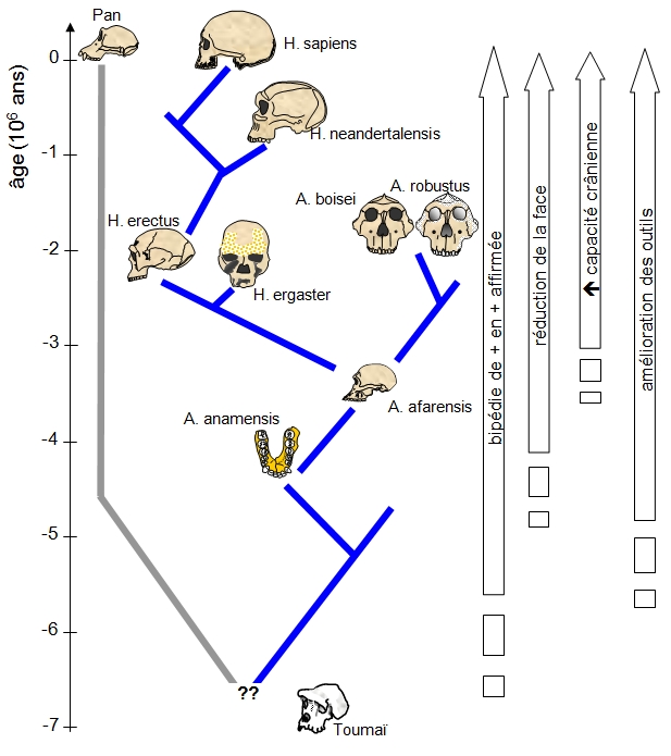 Depuis l'ancêtre commun, de nombreux homininés se sont succédés pour parvenir à l'homme actuel cest ce que l'on apelle la lignée humaine.