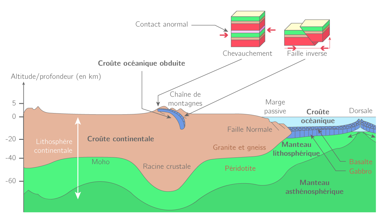 La lithosphère continentale est constituée d’une croûte continentale principalement composée de granite (ou de roches de la même famille) et d’un manteau lithosphérique composée de péridotites rigides. La croûte continentale affleure dans les régions émergées que constituent les continents.
