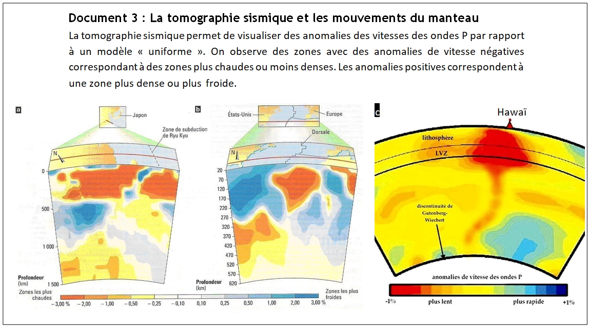 La tomographie sismique permet d’établir des « coupes » du globe terrestre grâce à une analyse des vitesses de propagation des ondes sismiques. Les vitesses enregistrées dépendent, notamment, des caractéristiques physiques du milieu traversé (température, pression).