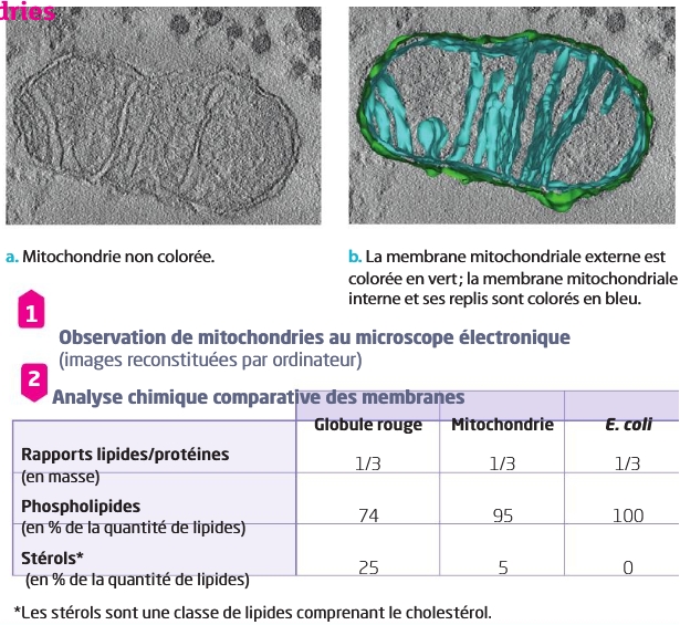 Les mitochondries sont des organites dans lesquels se réalise la respiration cellulaire. La composition chimique des membranes qui délimitent les mitochondries du cytoplasme de la cellule est analysée et comparée à celle de la membrane plasmique des globules rouges (cellules eucaryotes) et à celle d'une bactérie (E. coli). Le cytoplasme et l'intérieur des mitochondries sont des milieux aqueux