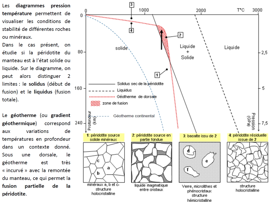 Des expériences faites en laboratoire permettent d'étudier le comportement de ces péridotites en fonction des conditions de pression et de température. Le résultat se traduit par un diagramme pression-température sur lequel apparaissent deux courbes, le solidus et le liquidus, qui séparent différents domaines.