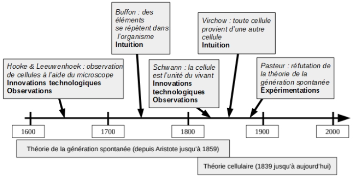 Dès l’Antiquité, Aristote élabore une théorie de l’être : il émet l’hypothèse que tous les êtres vivants doivent être composés de structures élémentaires simples qui se répètent. Ainsi, l’idée de divisibilité, qui nous semble liée aux observations microscopiques à partir du XVIIe siècle, est en fait apparue bien avant, de manière purement théorique.