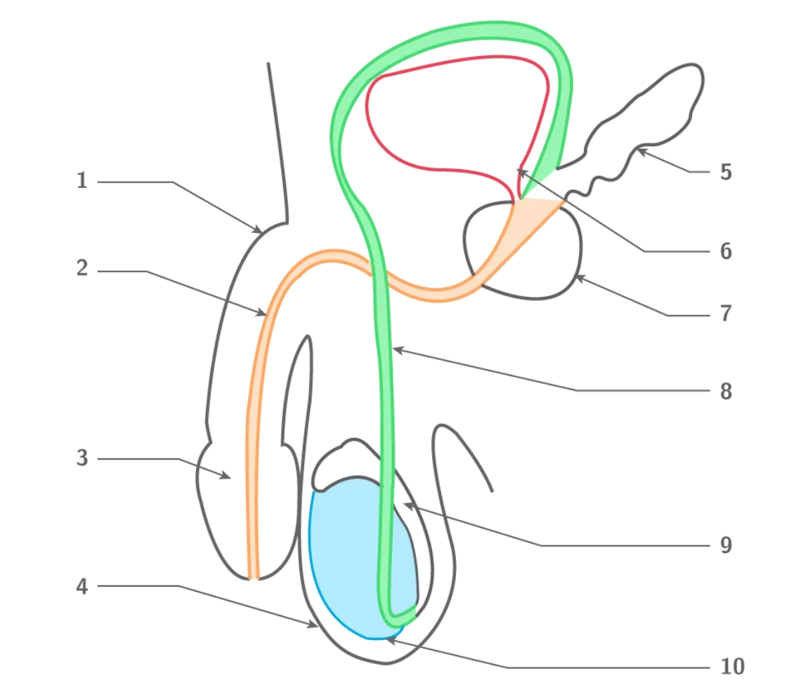 mots ou expressions à utiliser :   prostate   |  vessie   |  épididyme   |  canal déférent   |  testicule   |  gland   |  pénis   |  urêtre   |  vésicule séminale   |  bourse|scrotum   |     |