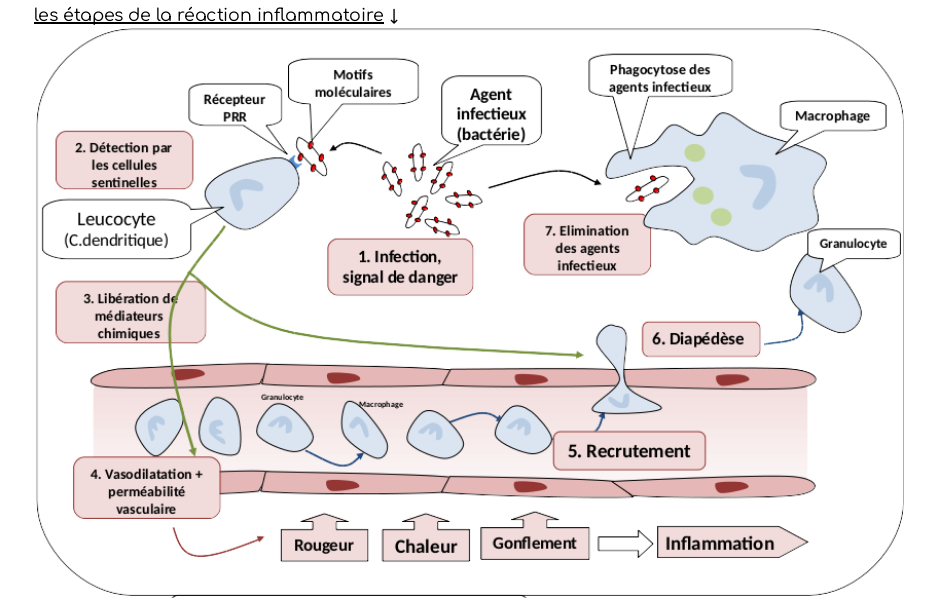 À la suite d'une blessure, des microbes pénètrent dans l'organisme et commencent à s'y multiplier, c'est l'infection. Une rougeur, un gonflement, une sensation de chaleur et une douleur se développent au niveau de la plaie, c'est une réaction inflammatoire de l'organisme. Le schéma montre comment la réaction inflammatoire parvient, la plupart du temps, à rapidement stopper l'infection.
