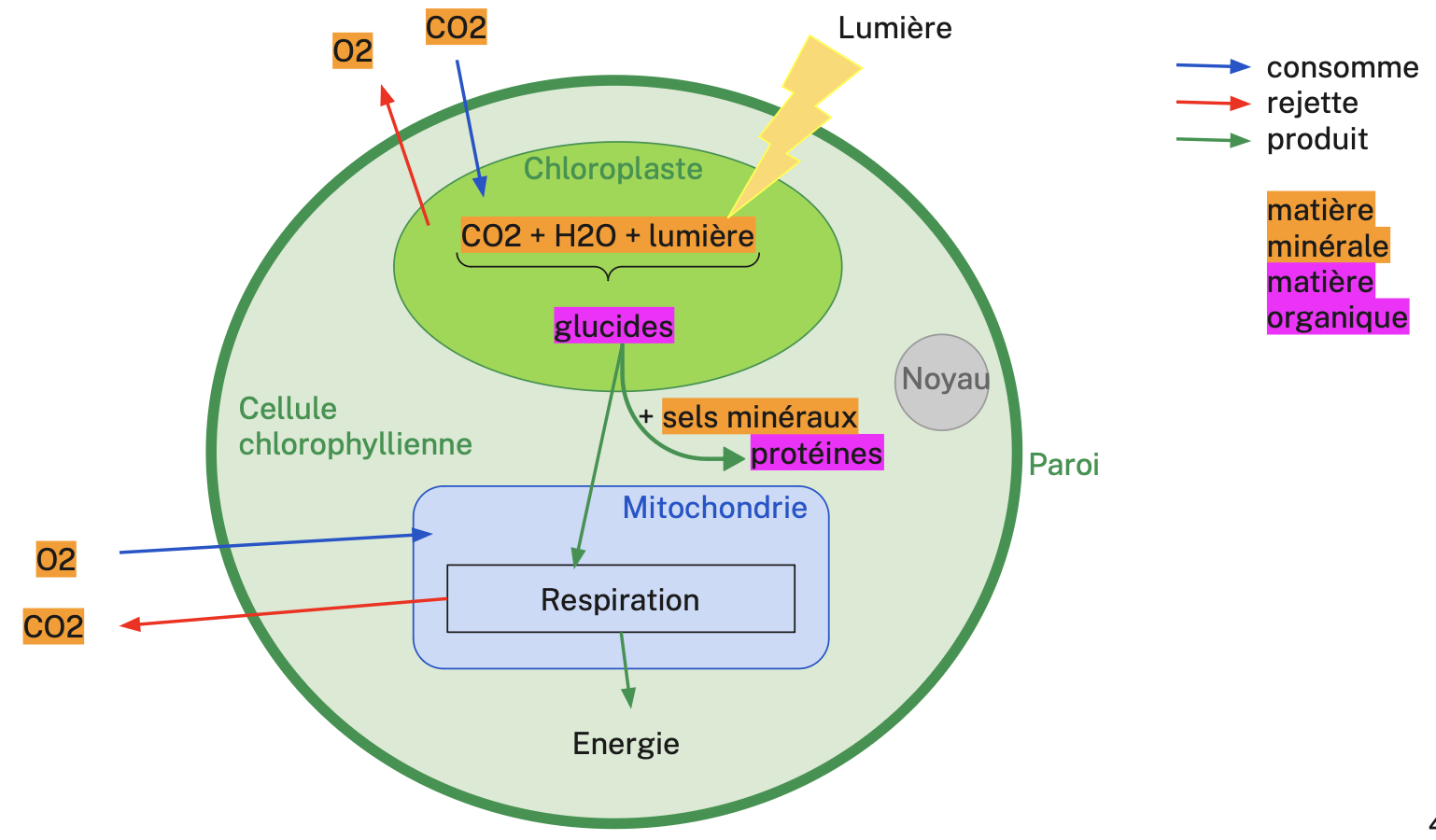 Cependant, les végétaux utilisent aussi la photosynthèse. C’est une voie métabolique qui utilise l’énergie lumineuse et la matière minérale pour produire de la matière organique (glucides, protéines). La photosynthèse s’effectue dans les chloroplastes, organites présents dans les cellules des plantes et des algues.