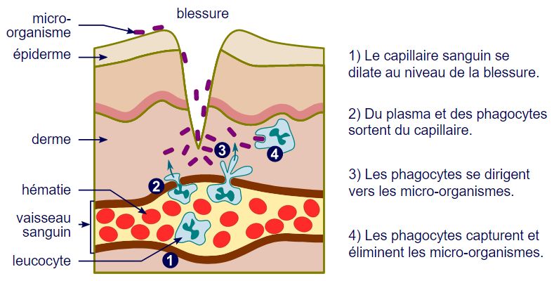 La réaction inflammatoire est caractérisée par 4 signes cliniques invariables : rougeur ;gonflement ;chaleur ;douleur. C'est l'afflux de plasma sanguin vers le site de l'infection ou de la lésion qui est associé à ces symptômes.