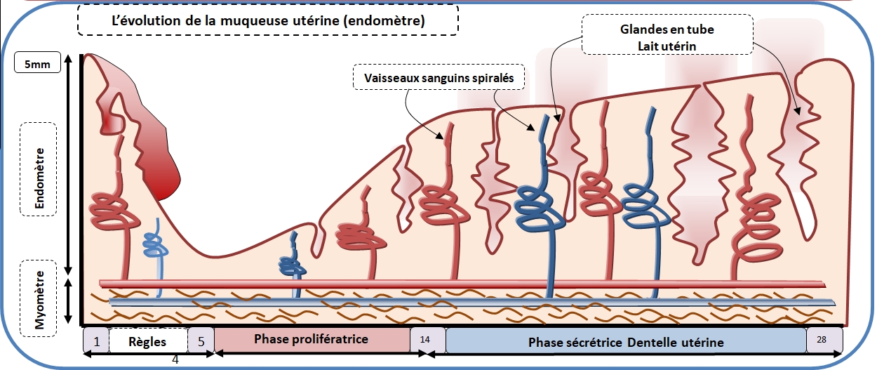 L'endomètre s'enrichit en sang pour pouvoir accueillir et assurer le développement d'une éventuelle cellule oeuf (ovule fécondé par un spermatozoïde).